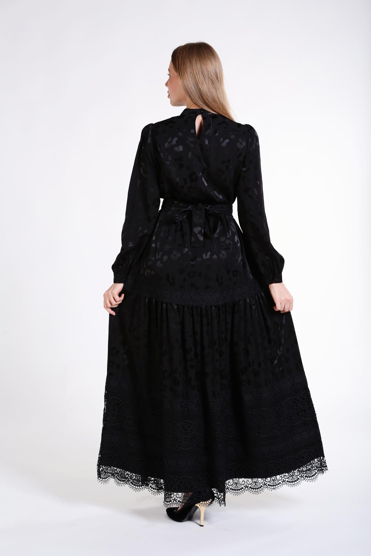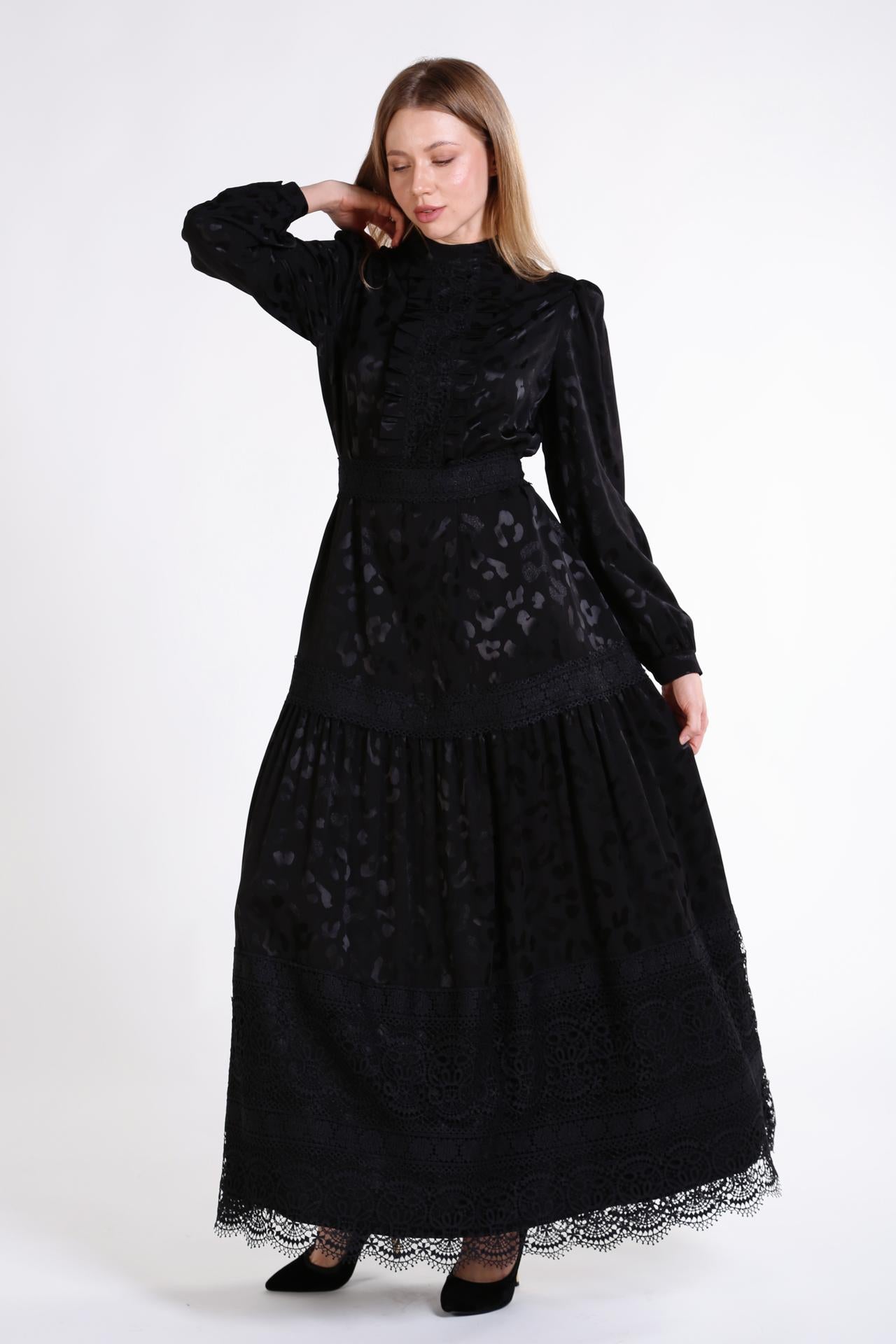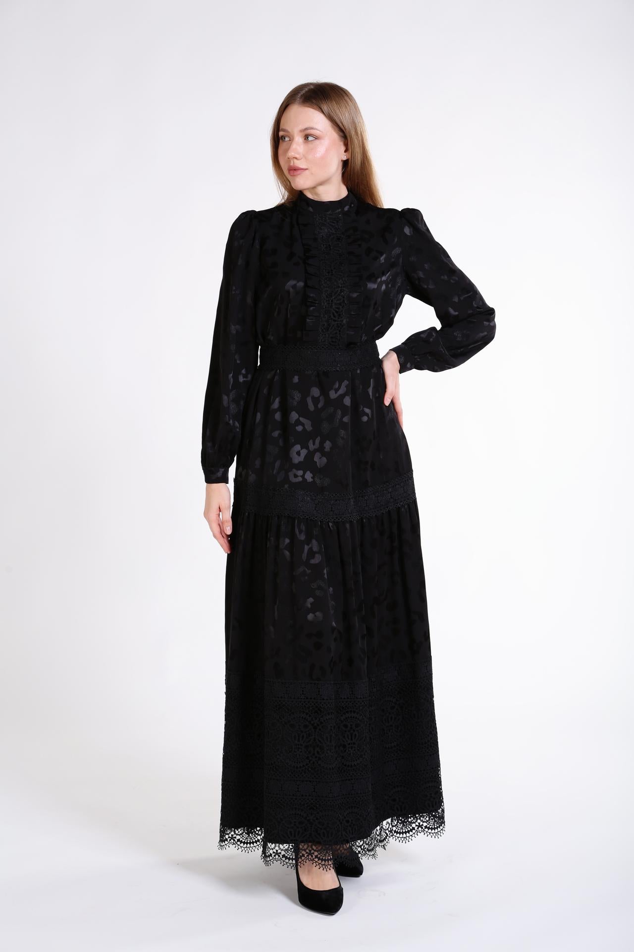 Dantel Detaylı Jakarlı Kumaş Uzun Elbise