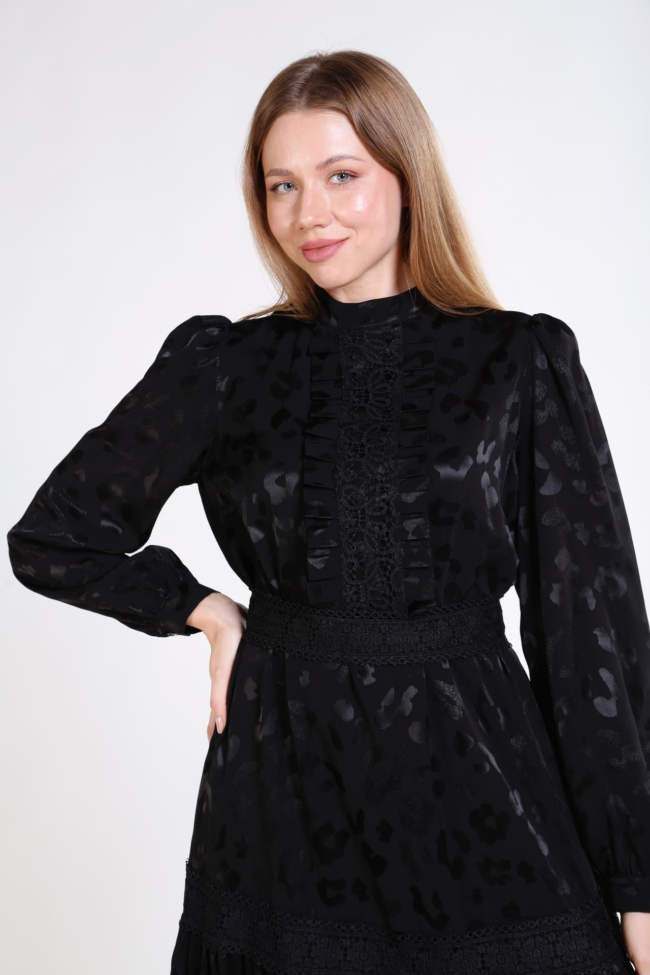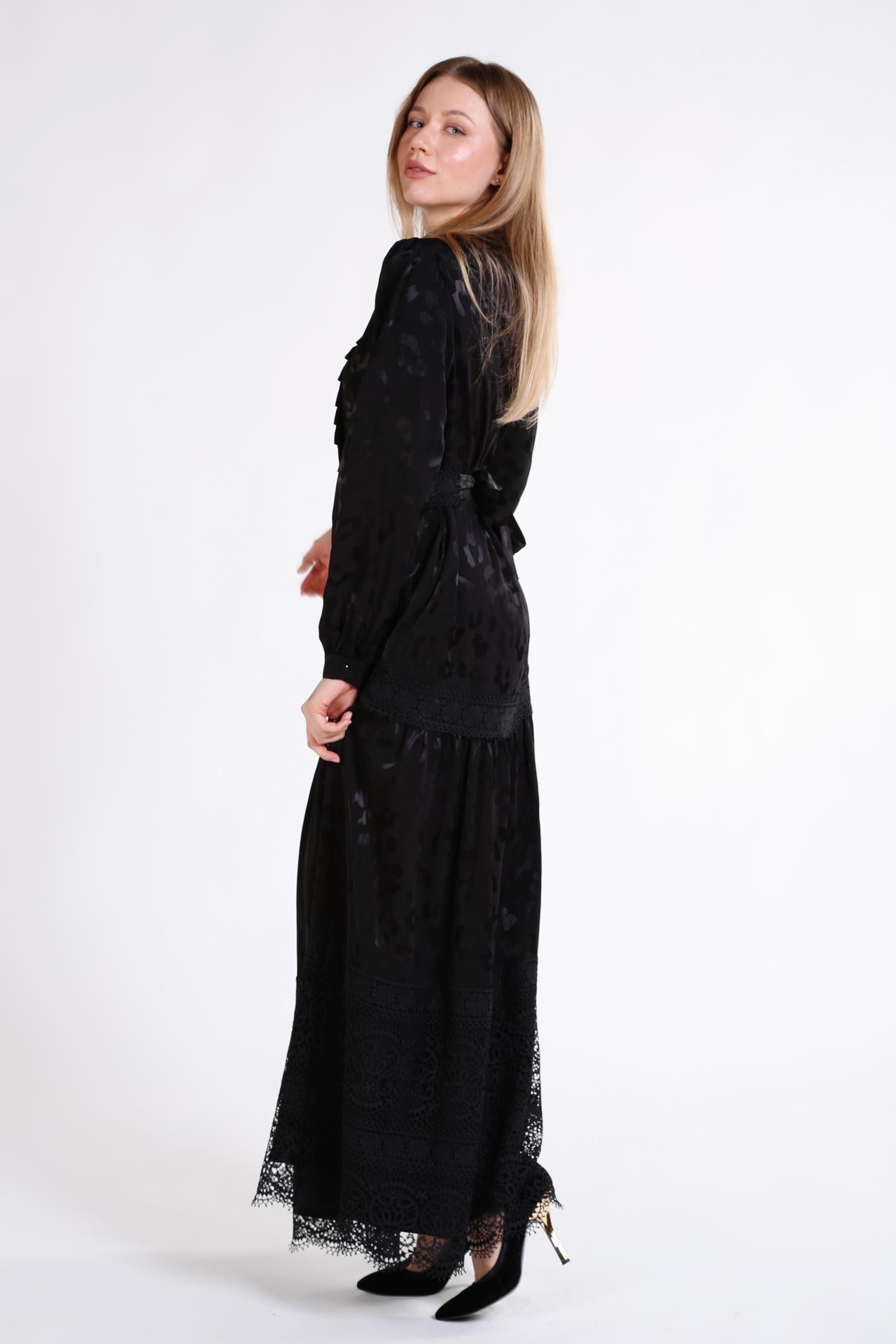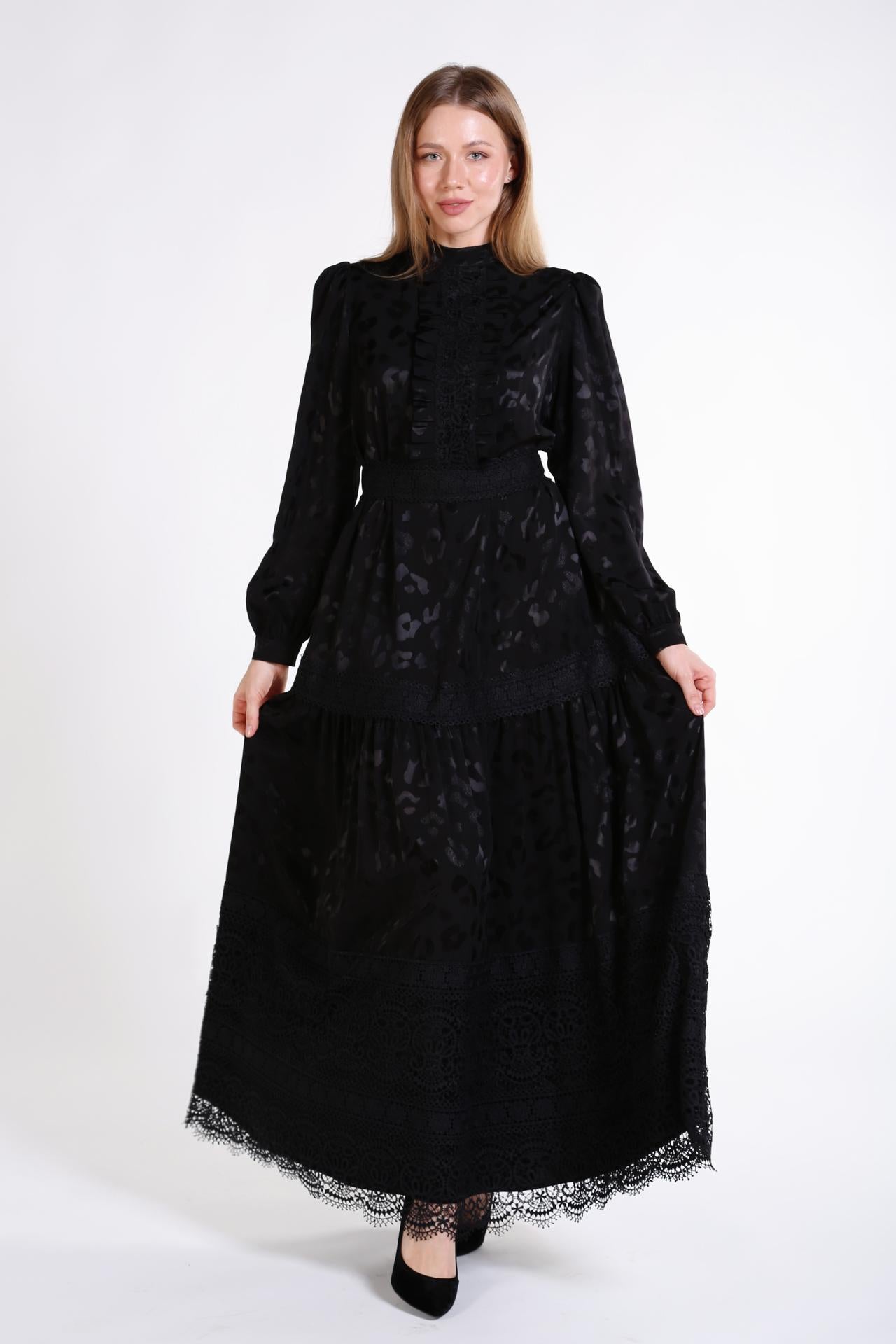 Dantel Detaylı Jakarlı Kumaş Uzun Elbise