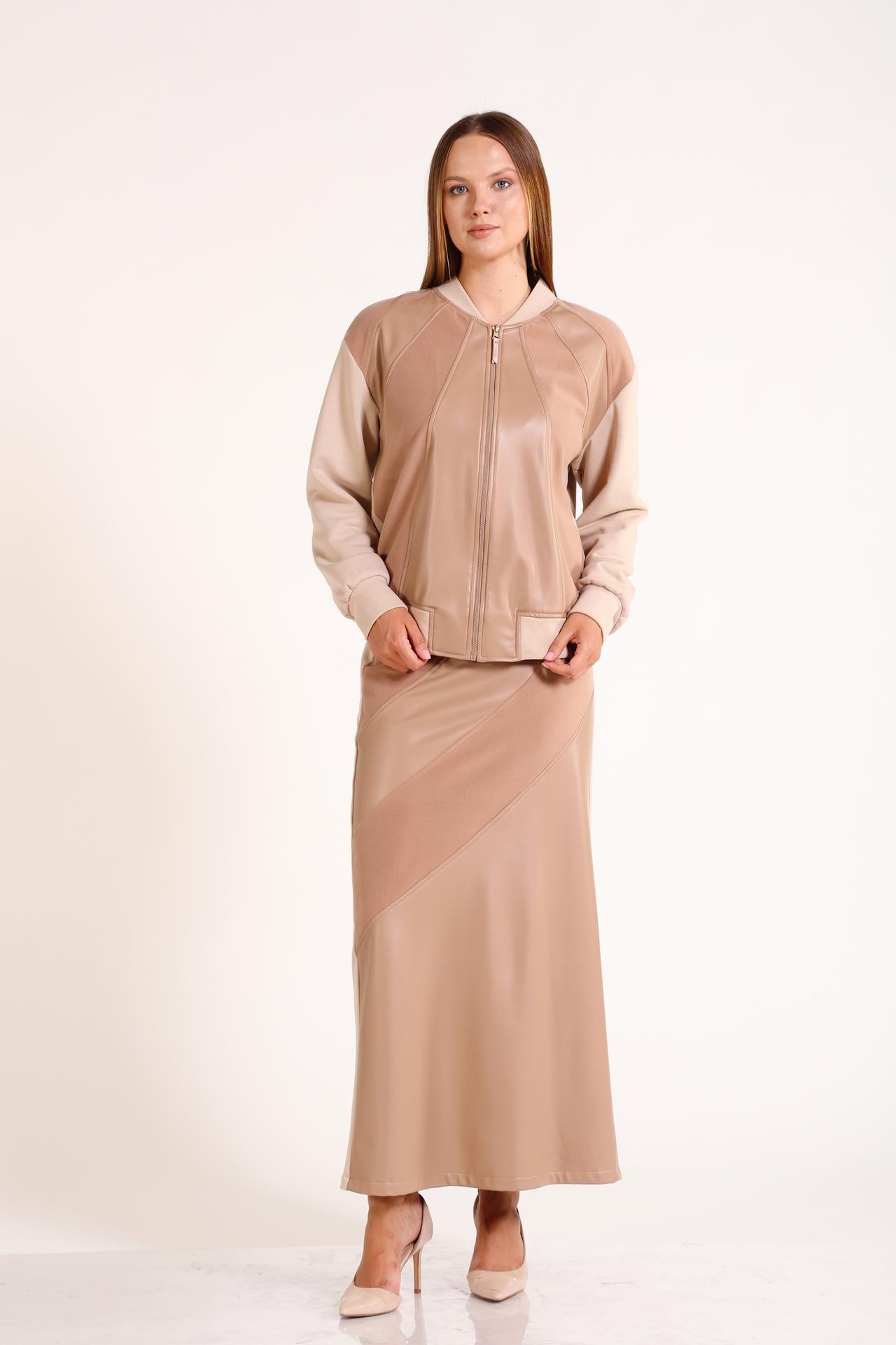 Sassofono'nun deri garnili etek-mont takımı, modern ve sofistike stilini yansıtarak profesyonel kadınlara özgüven katacaktır. Bu çarpıcı ve kaliteli takım, iş ve sosyal etkinlikler için mükemmel tercihtir.